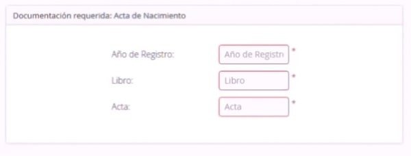 En este paso, deberás completar los datos de tu acta de nacimiento: